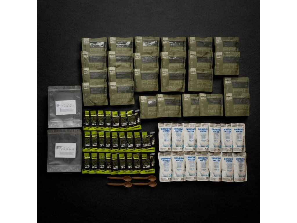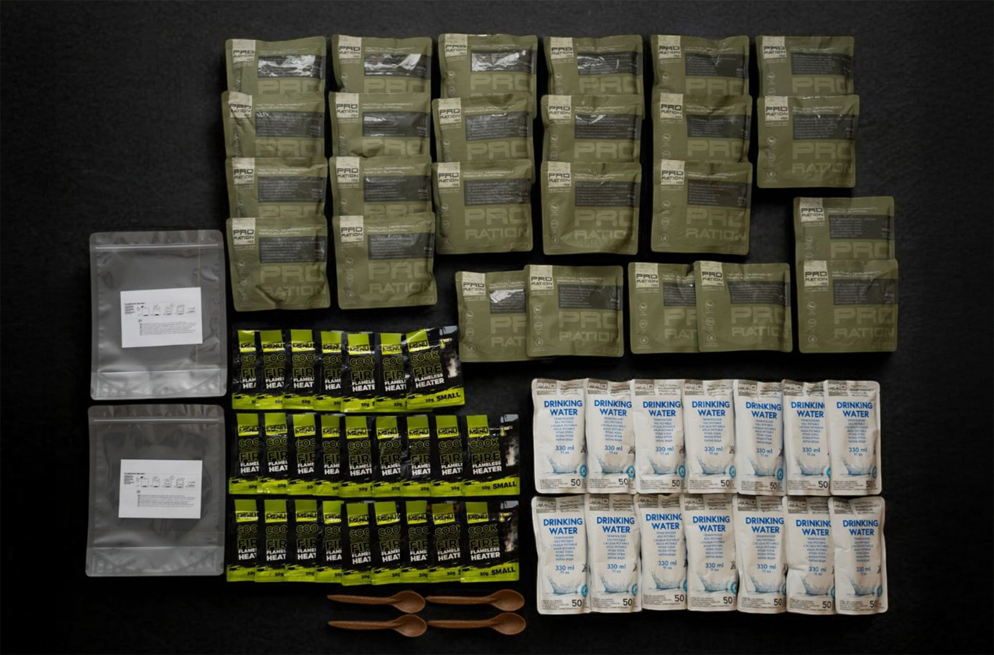 An emergency food supply ideal for homes, basements, or cabins. It contains 23 ready-to-eat meals with a shelf life of up to 15 years, 12 pouches of drinking water lasting up to 50 years (intended as an emergency reserve, not a full hydration supply), spoons, and self-heating packs. 100% natural ingredients, no additives — just honest, real taste. A complete supply that will feed a family of four for the first 72 hours of a crisis.