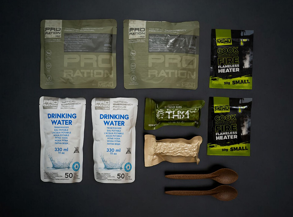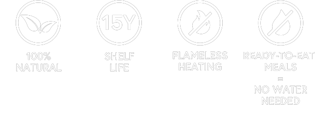 A practical food and water pack with a 15-year shelf life for meals and up to 50 years for water. Perfect as an emergency supply for your car, evacuation bag, or home preparedness kit — for individuals or smaller households. Includes two hearty meals, high-energy bars, drinking water, and a self-heating system.