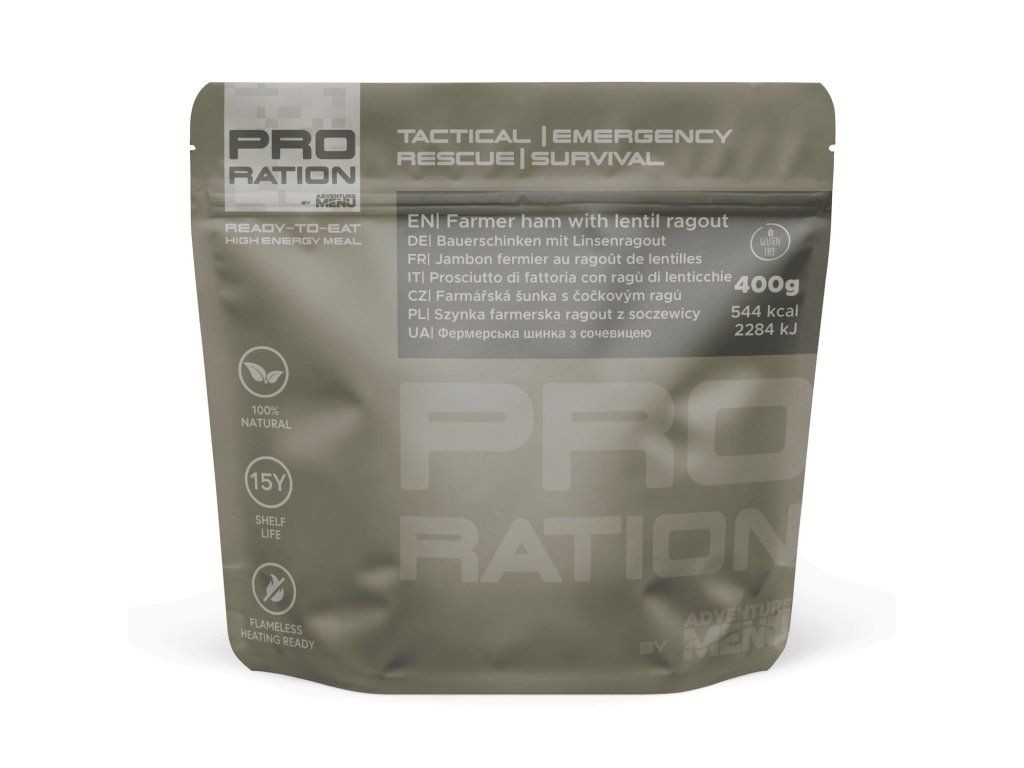 Farmer ham with lentil ragout 400 g: black Beluga lentils (23%), ham (20%, pork (min. 98%), water, salt with iodine, flavour, spice extract), leek, carrot, celery, balsamic vinegar (fermented grape vinegar, concentrated grape must, contains SO2), canola oil, garlic, salt, pepper.