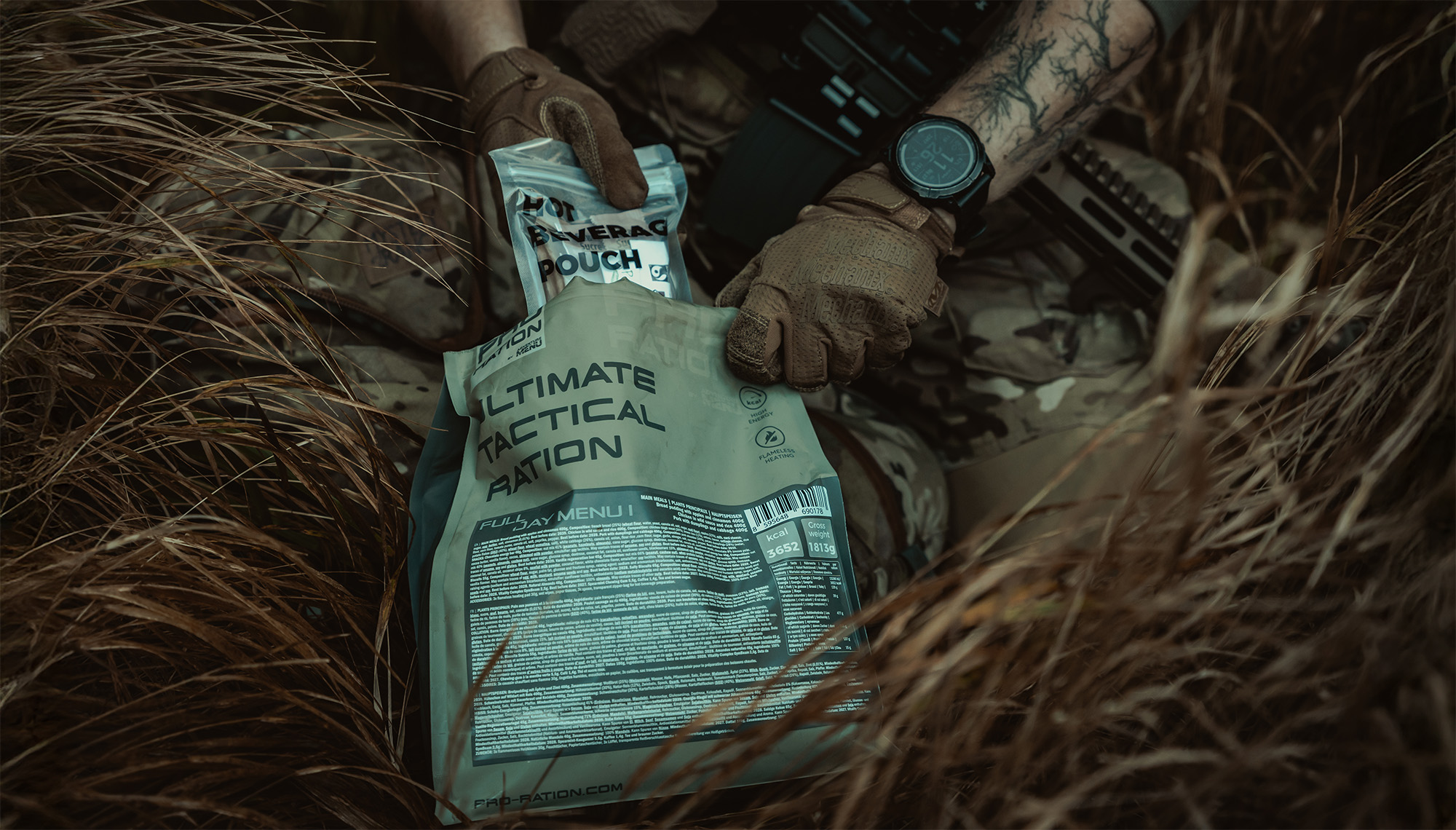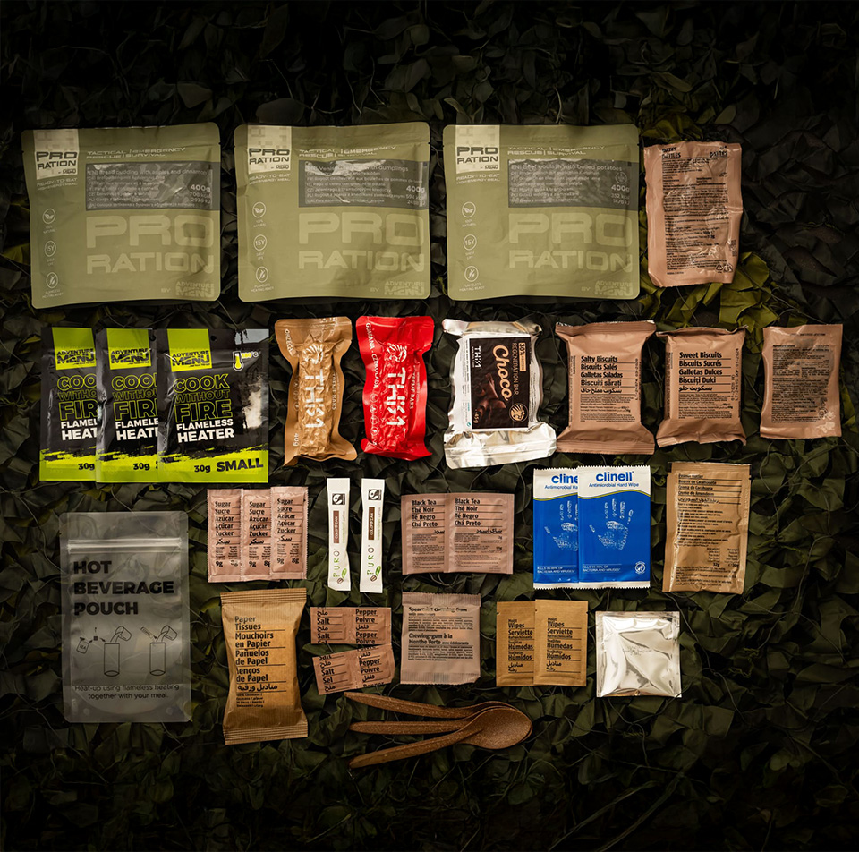 A complete 24-hour food ration. Three main meals, a varied selection of energy and protein bars, sweet and savory snacks, coffee, tea, and other practical essentials. Plus a flameless heating system — all packed in a compact, durable format designed to withstand harsh conditions and demanding days. Made from 100% natural ingredients, with no additives — just honest, real flavor.