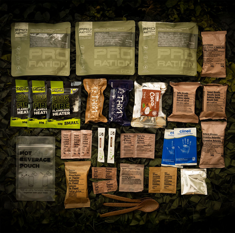A complete 24-hour food ration. Three main meals, a varied selection of energy and protein bars, sweet and savory snacks, coffee, tea, and other practical essentials. Plus a flameless heating system — all packed in a compact, durable format designed to withstand harsh conditions and demanding days. Made from 100% natural ingredients, with no additives — just honest, real flavor.