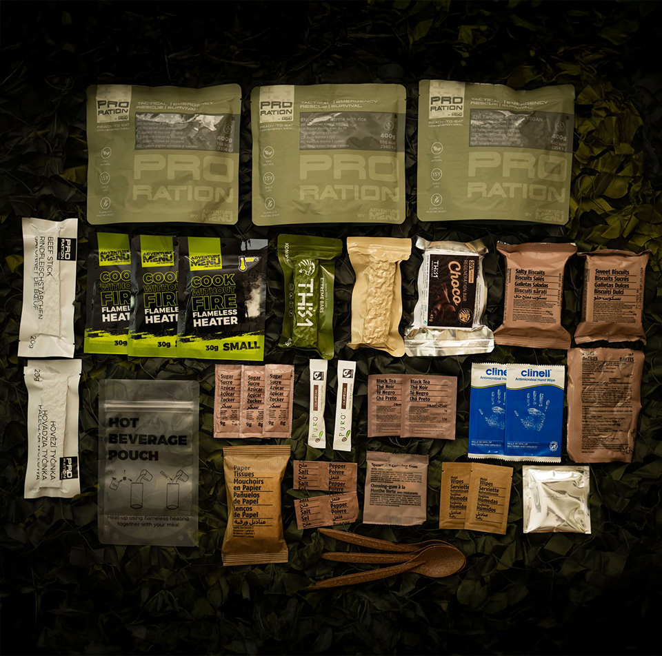 PRO-RATION Tactical are combat rations designed for the 21st century. Tasty, natural, and optimized for compactness and low weight. They combine high-quality main meals, nutritious snacks, supplements, and a flameless heater.