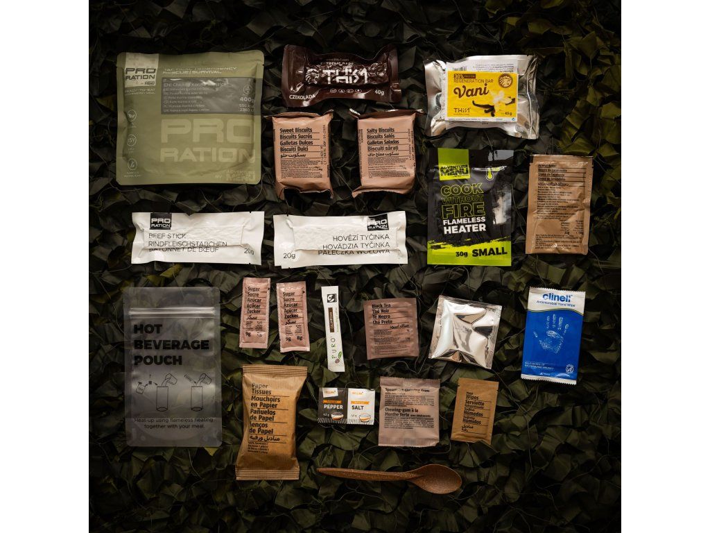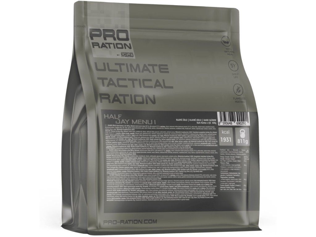 A tactical food ration for half a day. It includes one main meal, a varied selection of energy and protein bars, sweet and salty snacks for quick energy, plus coffee, tea, and other practical essentials. Ideal for shorter missions, field duty, or as part of your gear.