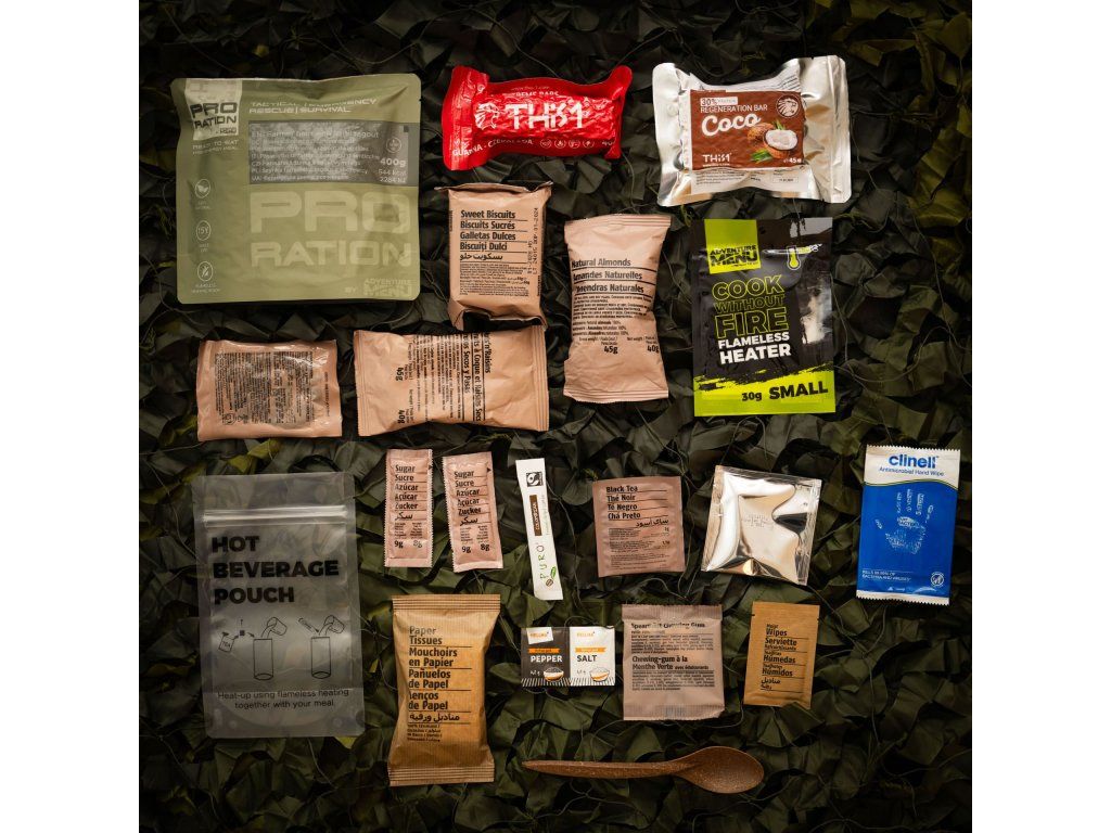 A tactical food ration for half a day. It includes one main meal, a varied selection of energy and protein bars, sweet and salty snacks for quick energy, plus coffee, tea, and other practical essentials. Ideal for shorter missions, field duty, or as part of your gear.