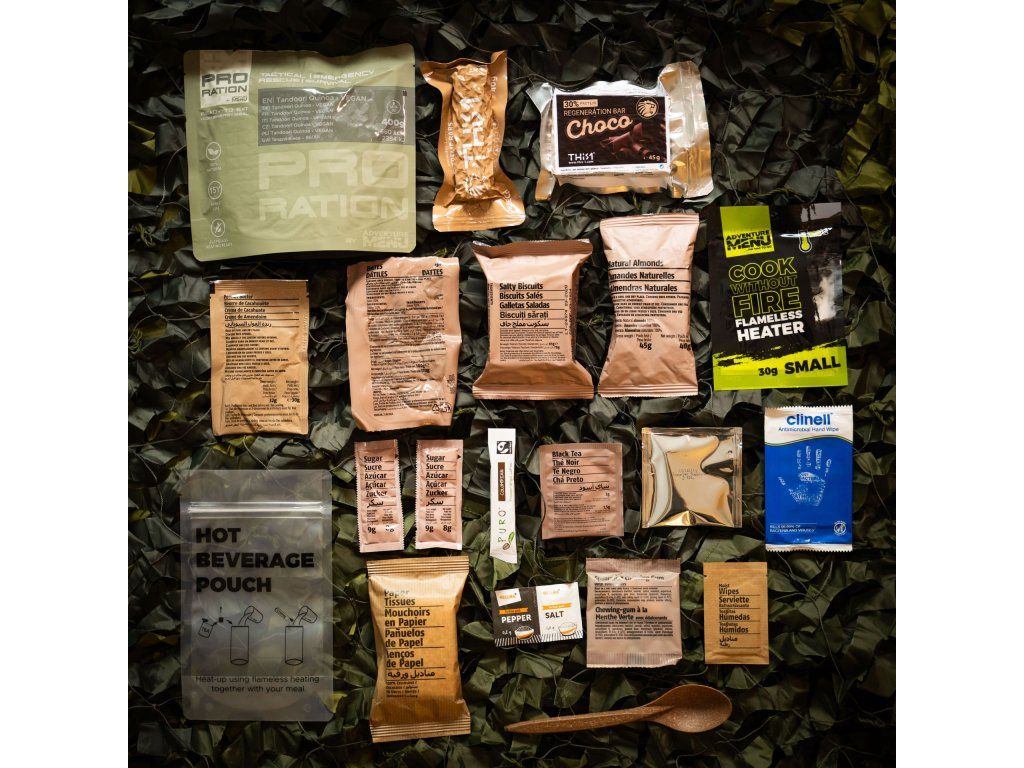 A tactical food ration for half a day. It includes one main meal, a varied selection of energy and protein bars, sweet and salty snacks for quick energy, plus coffee, tea, and other practical essentials. Ideal for shorter missions, field duty, or as part of your gear.